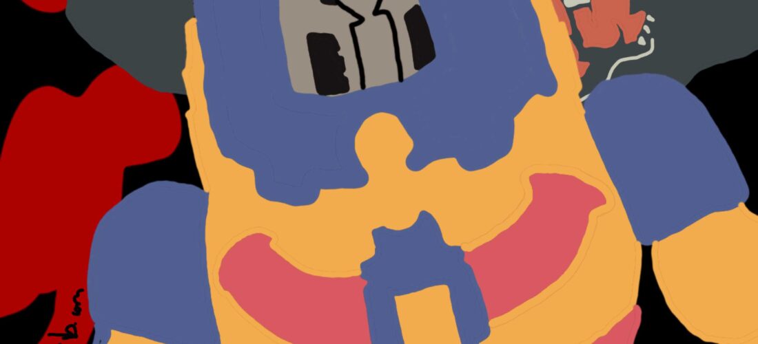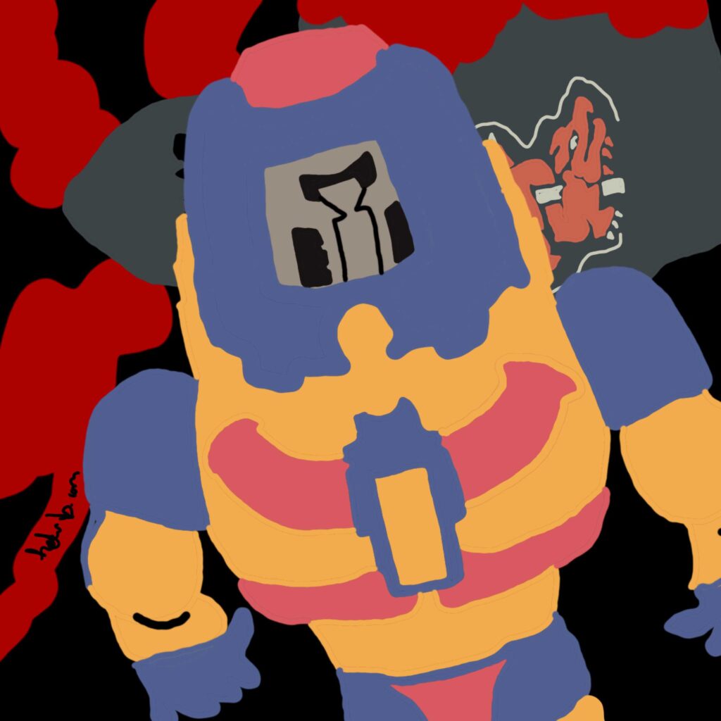A sudden change in the way Man-E-Faces moves makes it clear, he’s the robot now. And that makes him extremely smart and strong. Instead of trying to get Ninjor off his back, and to get back up, he rolls onto his back, an onto Ninjor. In a very unnatural way his arms move back, and he starts hammering the back of his helmet against Ninjor’s head. The martial arts fighter is locked under his enemy, who does not stop to hammer down his head until blood and brain sprinkle the ring. A barbaric move by a humanoid robot with maybe a little evil magic acting ends this titfortat.. Ninjor lost.